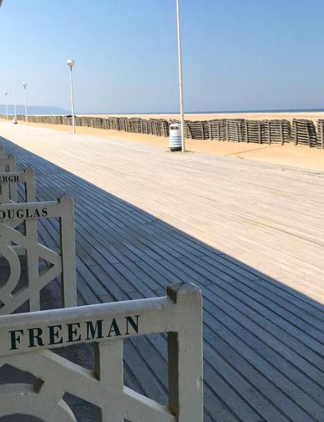 Longue plage de sable urbaine comprenant des parasols colorés, des cabines de bain, des bars et des promenades.